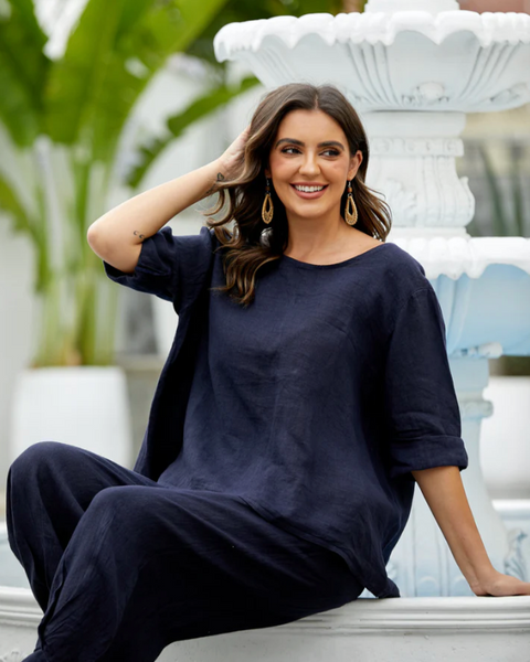 Embrace effortless style and comfort with the Mea's Linen Breeze Button-Back Top. Crafted from breathable, lightweight linen, this chic tee is perfect for staying cool on warm days. The boatneck design adds a relaxed yet refined look, while the unique button-up back introduces a modern twist to a classic silhouette. Finished with rolled sleeves for a laid-back vibe, this top is your go-to for effortless elegance and all-day comfort, whether you're enjoying a sunny stroll or relaxing on the weekend.