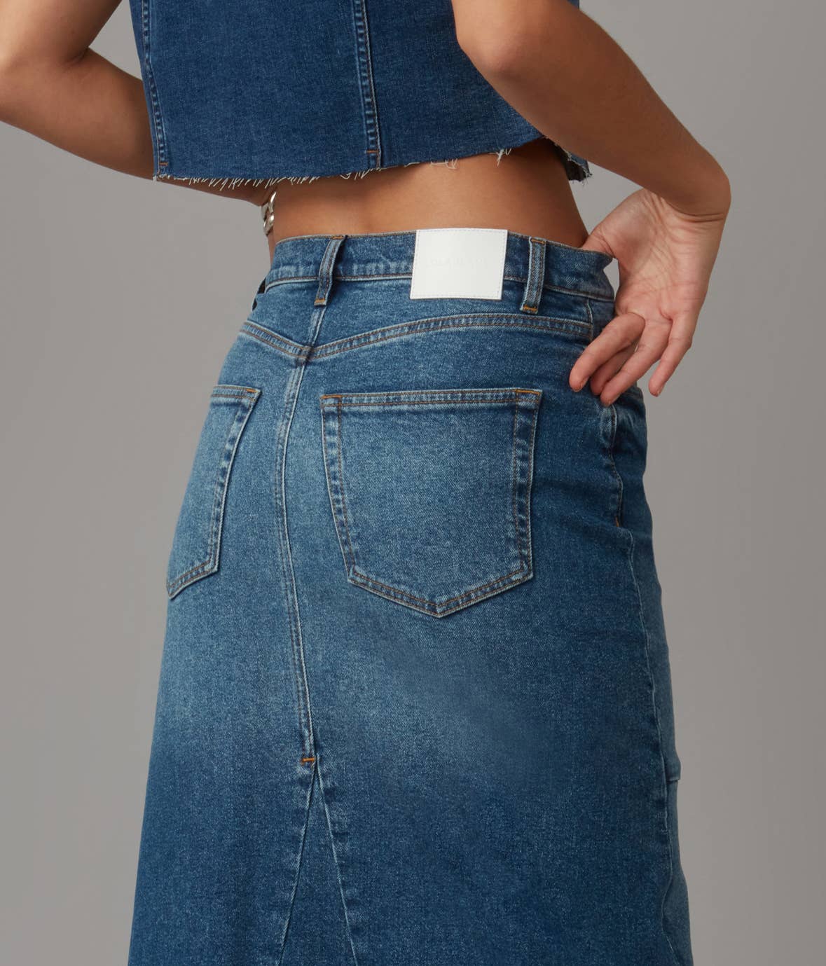 Machine wash inside out in cold water. Iron at medium heat. Do not dry clean. Do not bleach. Tumble dry low heat. High rise maxi skirt